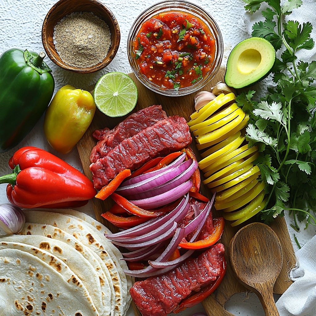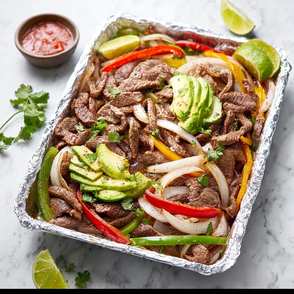 These Sheet Pan Steak Fajitas are a quick and flavorful meal, perfect for busy weeknights. Tender flank steak is seasoned with a robust blend of spices and baked alongside colorful bell peppers and red onions on a sheet pan, making cleanup a breeze. Served with warm tortillas, fresh salsa, creamy avocado, lime, and cilantro, this dish promises vibrant Tex-Mex flavors with minimal effort.
