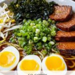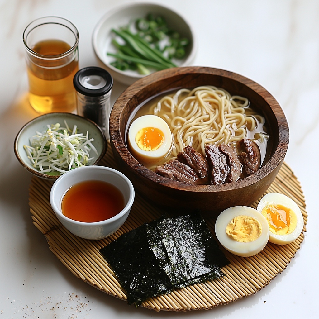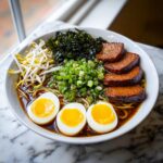 Ladle the hot, fragrant broth over the noodles until they’re nicely submerged. Then, artfully arrange slices of chashu beef, soft-boiled eggs, bean sprouts, green onions, and nori strips on top to create a colorful, inviting bowl that’s ready to eat.
