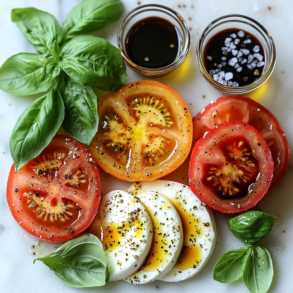 Gathering simple, high-quality ingredients is what makes this salad truly shine. Each component plays a vital role — the tomatoes bring juicy sweetness and vivid color, the fresh mozzarella adds a cool creaminess, and the basil leaves provide aromatic freshness that ties everything together.