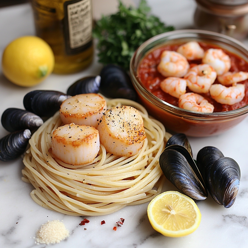 Start by boiling a large pot of salted water and cook your linguine or spaghetti just until al dente, following the package instructions closely. This ensures your pasta has just the right amount of firmness to hold up under the luscious seafood and marinara sauce that will come next. Once done, drain it well and set it aside, keeping it warm.