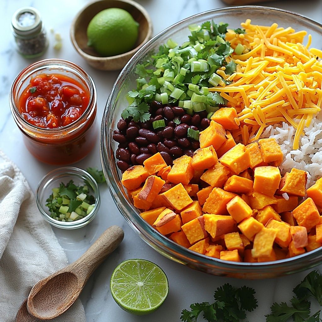 Start by gathering your ingredients right into a large skillet. Add the uncooked rice, salsa, diced sweet potatoes, black beans, diced green chilies, chili powder, and chicken or vegetable broth all at once. This one-pot approach saves time, making the cooking process both efficient and mess-free.