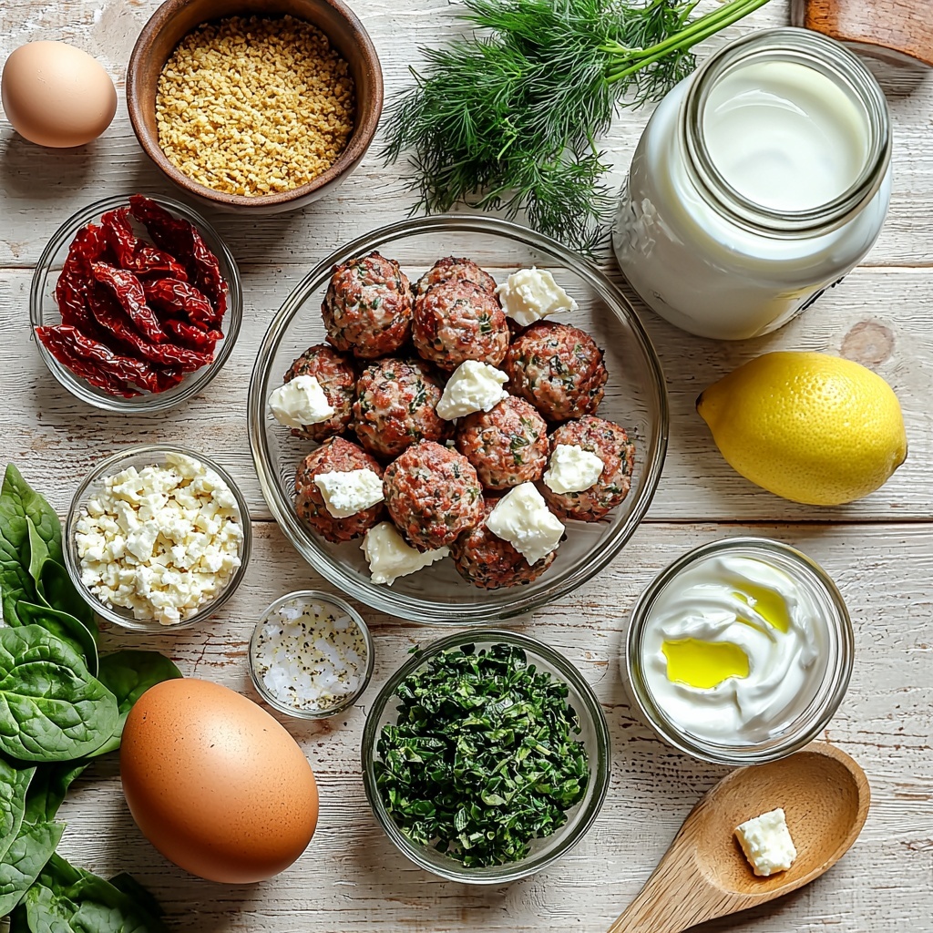 Begin by soaking the bread crumbs in milk in a medium bowl for 3-4 minutes until they become soft and moist but not soggy. This step is crucial because it ensures your meatballs turn out tender and juicy. Next, add the ground turkey, beaten egg, chopped sun-dried tomatoes, baby spinach, crumbled feta, fresh parsley, minced garlic, and all the dried herbs and seasonings. Gently combine everything with a spoon or your hands, taking care not to overwork the meat to keep the texture light and tender.