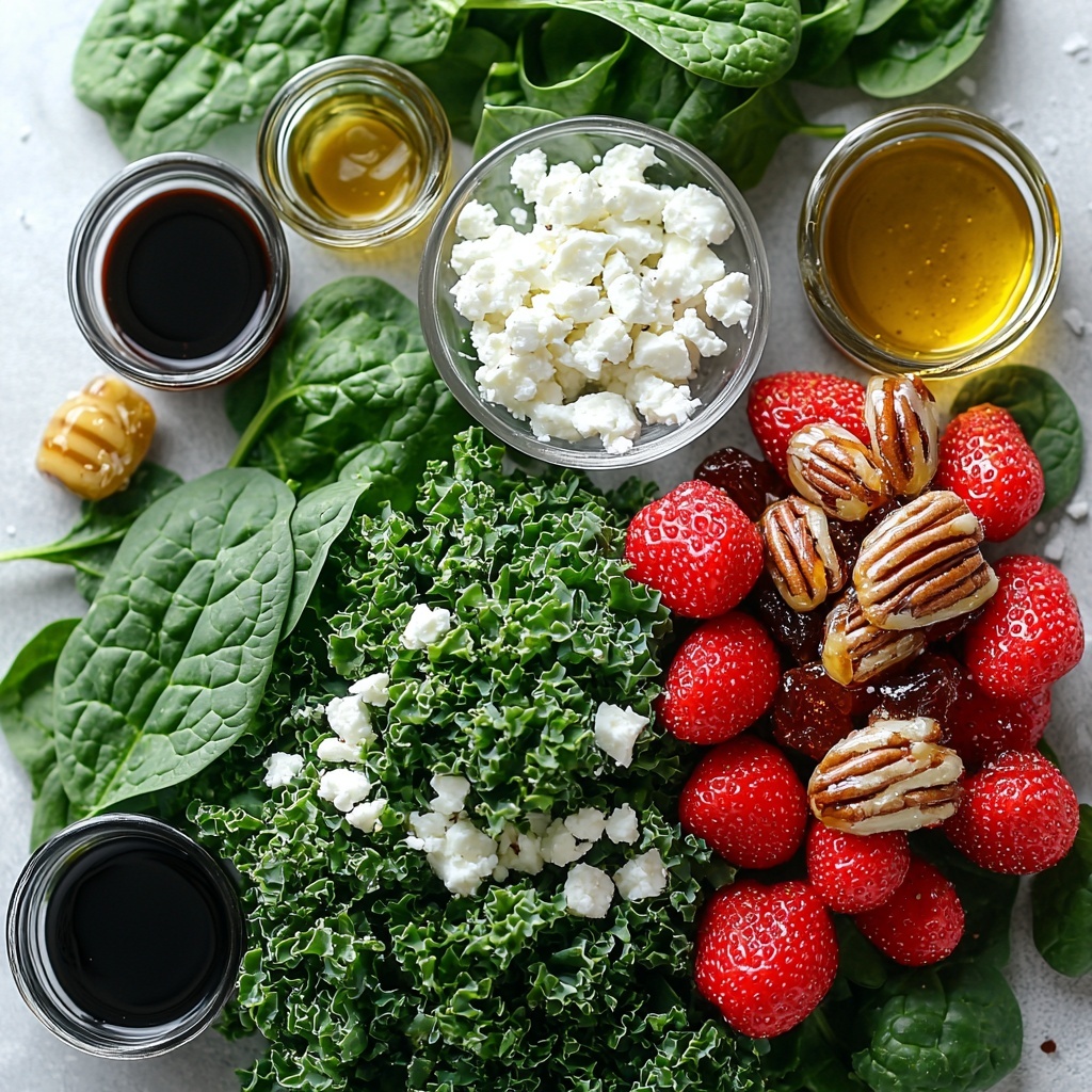 The beauty of this salad lies in its simplicity, with ingredients that are easy to find but vital for delivering unforgettable flavor and texture. Each one plays an essential role, from the peppery spinach and juicy strawberries to the creamy feta and crunchy pecans.