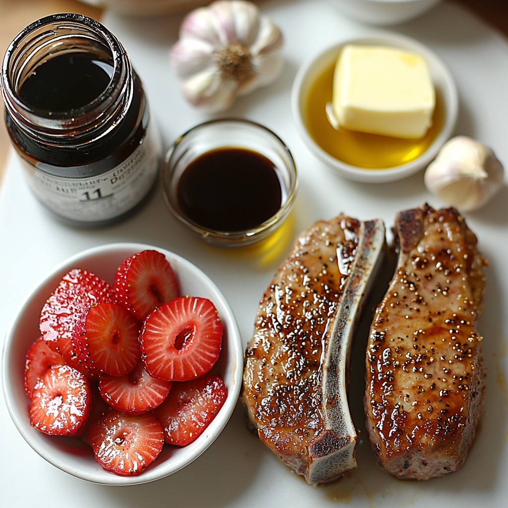 These ingredients are delightfully simple yet essential to create a mouthwatering combination of flavors, textures, and vibrant colors. Each element brings its own magic, from the juicy pork chops to the glossy, strawberry-infused balsamic glaze.