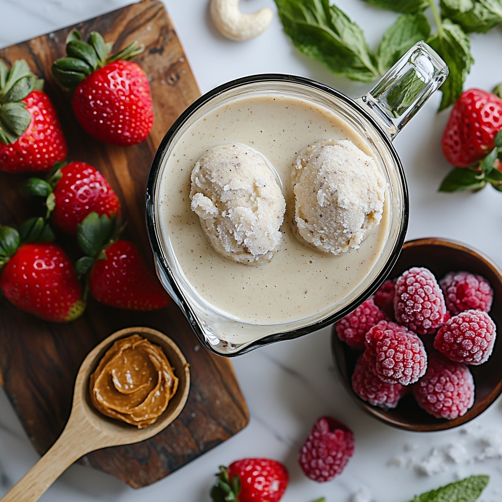 - Blend the Smoothie: Add the cashew milk, frozen bananas, strawberries, frozen raspberries, Ka’Chava Vanilla Protein Powder, almond butter, vanilla paste, and pinch of salt into a high-powered blender. Start blending on low speed for 30 seconds to combine the ingredients, then gradually increase to medium-high speed and blend for an additional 2 minutes until smooth and creamy.