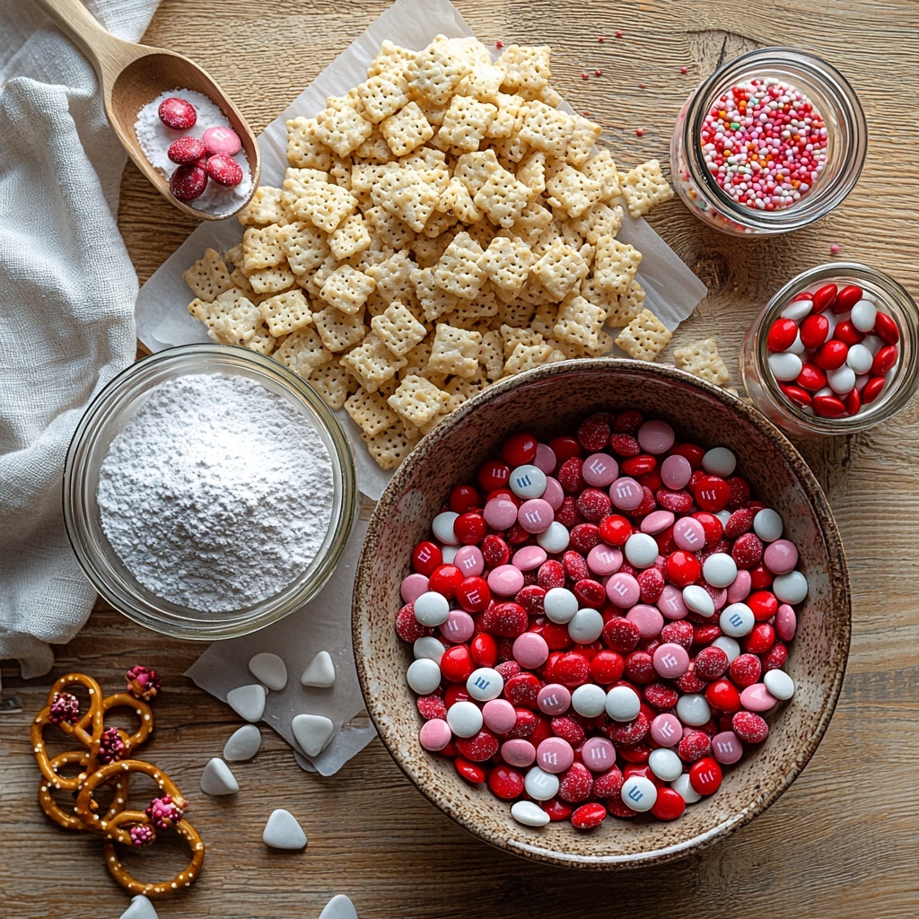 - 2 Tbsp red, pink and white sprinkles: Adds a joyful festive touch to make the mix visually irresistible.