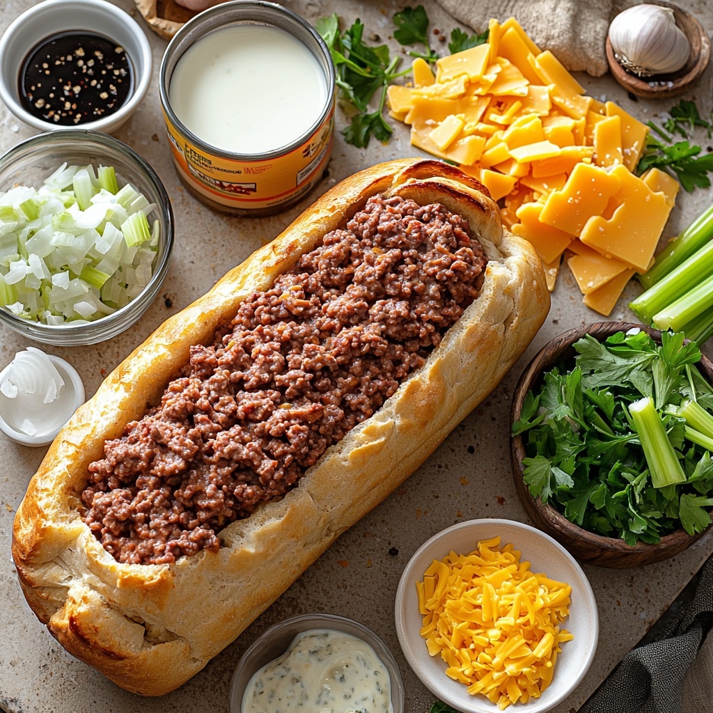 This Stuffed French Bread recipe features a deliciously savory ground beef mixture blended with celery, garlic, and cream of celery soup, all nestled inside a hollowed-out French bread loaf and topped with melted cheddar cheese. Baked to perfection, it makes a comforting and hearty meal perfect for family dinners or casual gatherings.