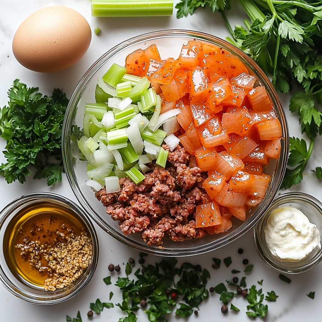 1. Sauté aromatics: In a large nonstick skillet, heat olive oil over medium heat. Add the minced onions and garlic, sautéing until the onions are translucent, about 4-5 minutes. Then add the celery and parsley and cook until the vegetables soften, approximately 3-4 minutes. Remove from heat and let the mixture cool.