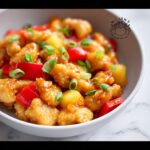 Sweet Fire Chicken is a flavorful and crispy stir-fried dish combining tender chicken pieces coated in a light batter, sautéed bell peppers, onions, and pineapple tidbits, all tossed in a deliciously sweet and spicy Thai chili sauce. This dish offers a perfect balance of textures and a kick of heat, making it an irresistible meal for any occasion.