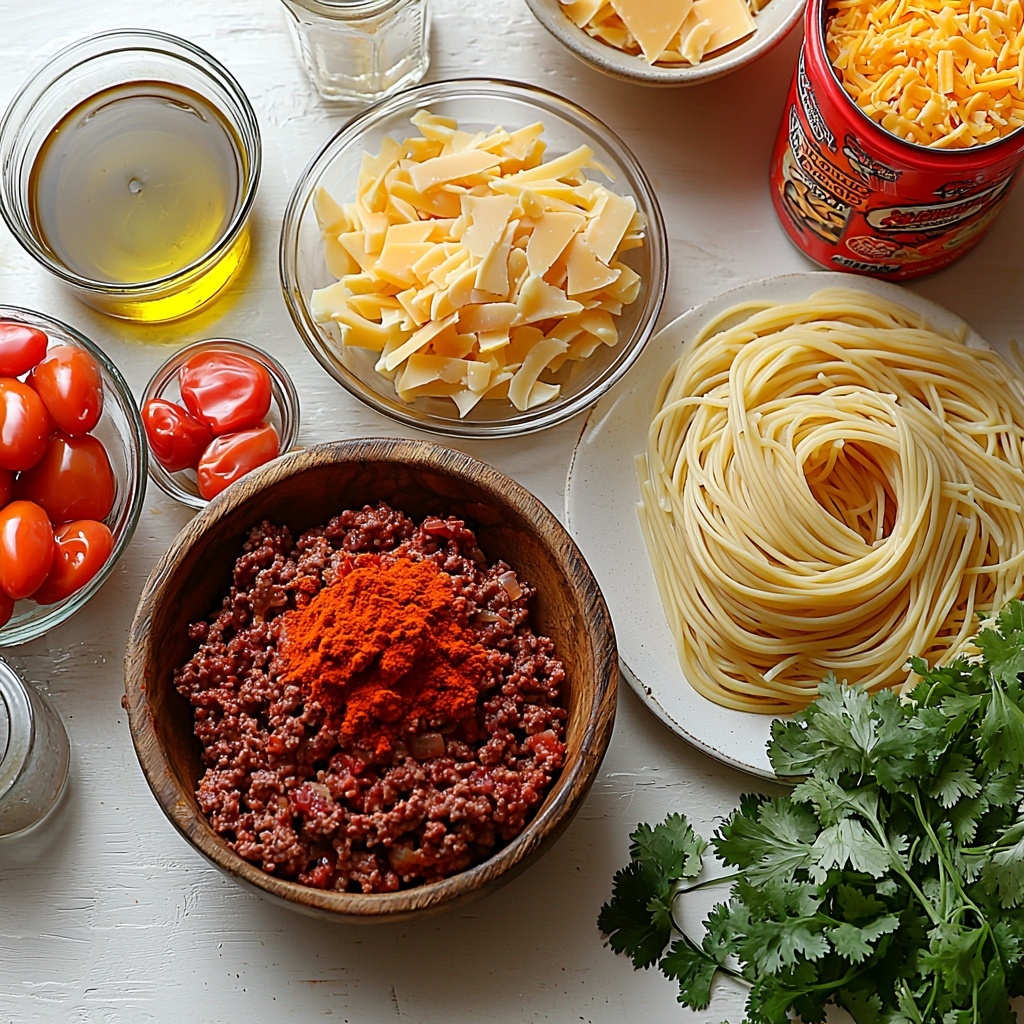 These ingredients are straightforward and familiar, yet each one plays a crucial role in creating the vibrant flavor and satisfying texture of this Taco Spaghetti Recipe. From the savory ground beef to the spicy Rotel tomatoes, every item brings something special to the table.