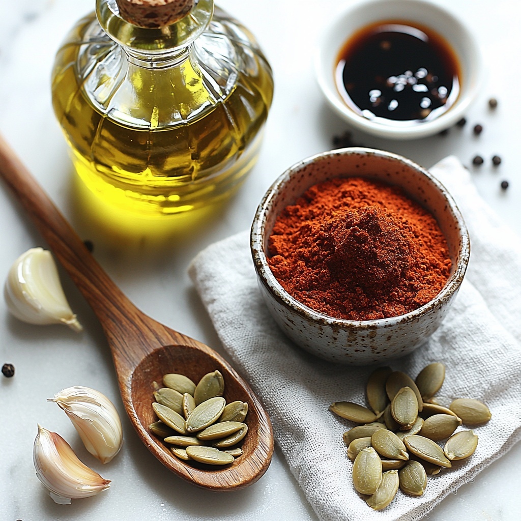 In a mixing bowl, toss the dried pumpkin seeds with olive oil and tamari sauce until every seed is gleaming with flavor. Then sprinkle in the garlic powder, smoked paprika, and black pepper, mixing well so the spices coat the seeds evenly. This combination is where the magic of this Tamari Roasted Pumpkin Seeds Recipe really begins to shine!