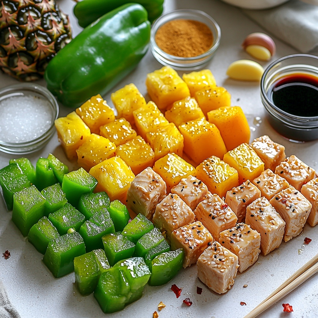 - Assemble the kebabs: Thread the marinated chicken cubes alternately with green bell pepper and pineapple pieces onto 10 metal or wooden skewers, ensuring even distribution.