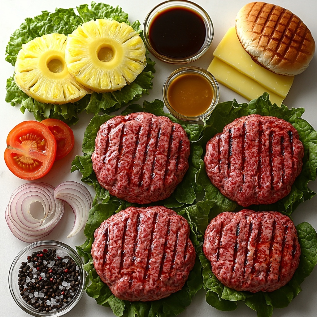 Tropical Burgers combine juicy, seasoned beef patties with sweet grilled pineapple and melty cheese on toasted brioche buns. Enhanced with fresh lettuce, tomato, red onion, and a flavorful spread of teriyaki sauce, these burgers offer a perfect balance of savory and sweet, ideal for summer grilling or backyard barbecues.