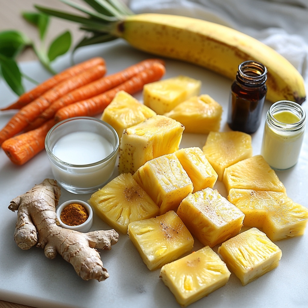1. Prepare Ingredients: Gather all fresh produce and liquids required for the smoothie. Peel and cut the carrots into chunks, slice the ginger, and cut the pineapple into pieces for easy blending.