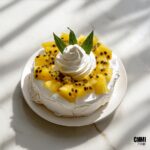 A light and airy Vanilla Pavlova topped with tropical pineapple and passion fruit. This dessert features a crisp meringue shell with a soft, marshmallow-like center, complemented by whipped cream and fresh, tangy fruit for a refreshing finish.