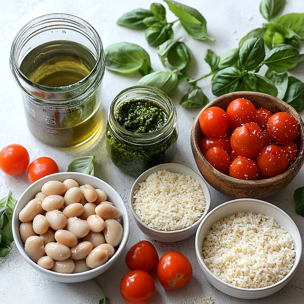 These ingredients are straightforward yet pack a flavorful punch, each one playing an important role in creating layers of taste, texture, and color in the White Bean and Pesto Bake Recipe.